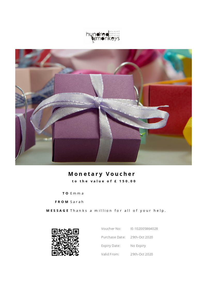 Hundred Monkeys allows you to purchase instantly printable gift vouchers, special offers and tickets using the Voucher Connect platform.